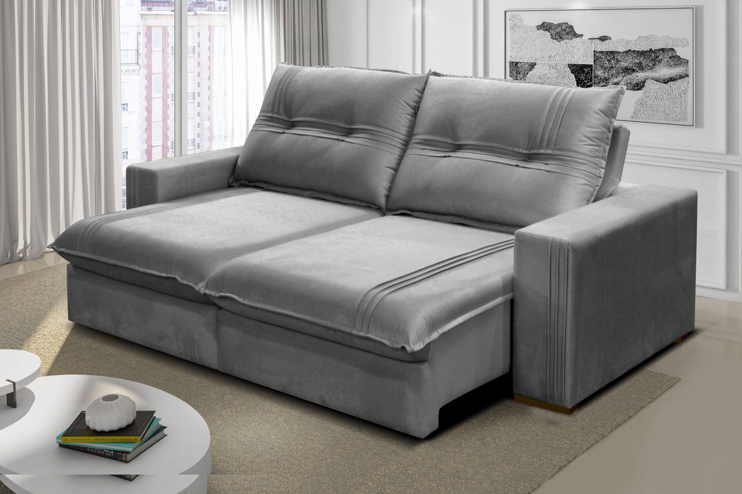 Sofá retrátil, com encosto reclinável e removível e braço reto